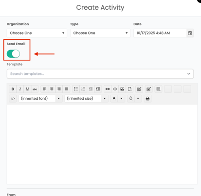 This means you can write an activity note and instantly share it via email without leaving Albi. Both the note and the email record will then show up in the Activities section of the organization.