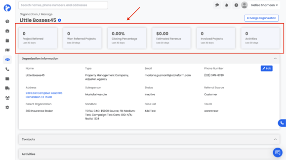 At the top of the Manage Organization page, you’ll see a series of KPI (Key Performance Indicator) cards. These cards give a quick snapshot of the organization’s performance and activity within Albi. Each KPI automatically pulls live data from projects, invoices, and activities linked to that organization.