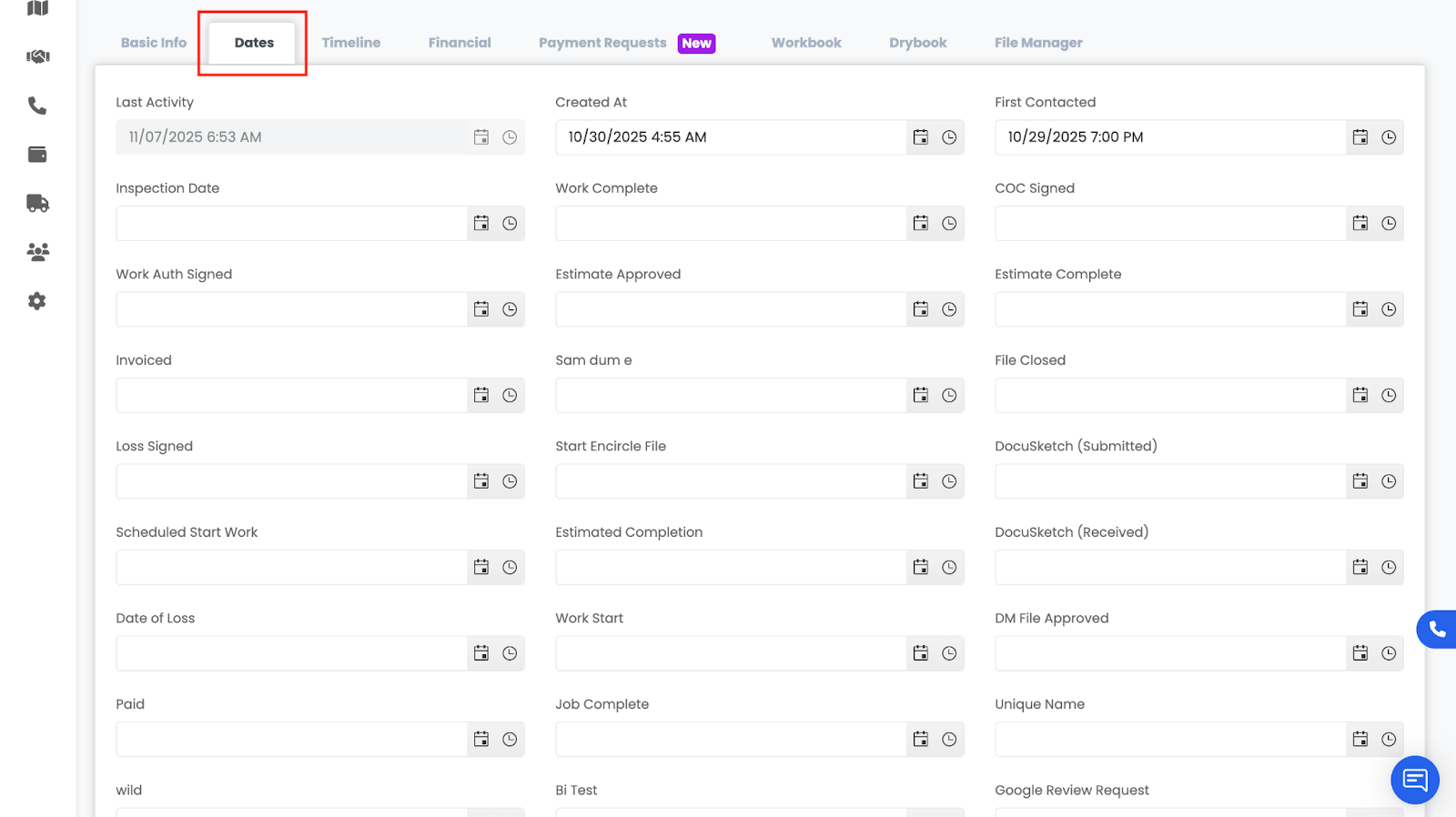The Dates tab in a project tracks all key milestones and timeline events throughout the job. This section allows you to view, add, and update important project dates such as first contact, inspection date, arrival on site, work completed, estimate created, invoice sent, and more. Dates help keep your project timeline accurate and ensure all team members are aligned on what has been done and what is coming next.
