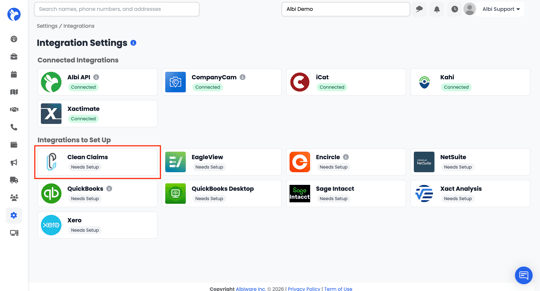 Heads up: Don't see Clean Claims in your Integrations list? Your account may need the Clean Claims entitlement turned on. Reach out to Albi Support or your Account Manager and we can enable it for you.