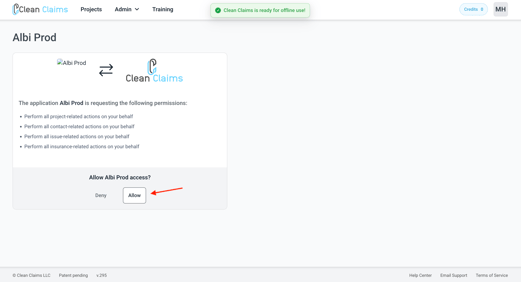 - You will be redirected to Clean Claims, which will show a message similar to: "The application is requesting the following permissions: perform all project, contact, issue, and insurance-related actions on your behalf."