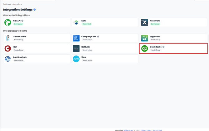 After connecting, you'll need to configure how Albi syncs with QBO. From the Integrations page, click Configure on the QuickBooks card to open the QuickBooks Settings panel.