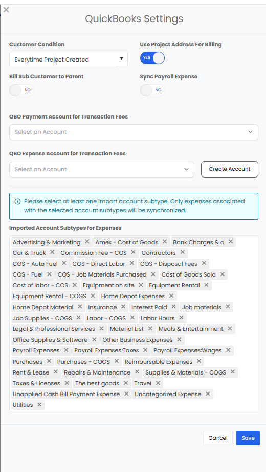 Tip: If you notice that some expenses aren't pulling from QBO into Albi, this list is the first place to check. Any expense whose account subtype isn't selected here will not sync into Albi — even though it exists in QBO.