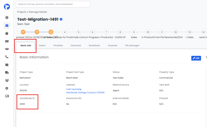 - On the project's Basic Info tab, look for the QuickBooks ID field — this should populate with the QBO Sub-Customer ID once the sync completes.