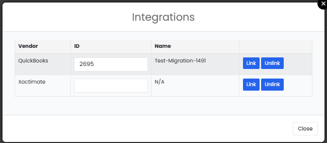 - The Integrations button at the top right of the project — opens a popover with the linked QBO record.