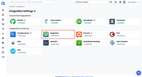 - Find EagleView in the list of integrations. The status below to it will show Needs Setup.