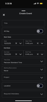 Learn how to create new events by entering key details such as title, date, and time, along with optional fields like project, location, and attendees.