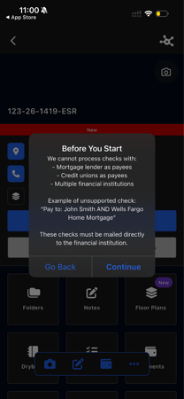 The back should be blank when scanned. If the check fails and needs reprocessing, a pre-signed check can't be retried digitally. - Do technicians need to verify their identity (Persona) to process checks?