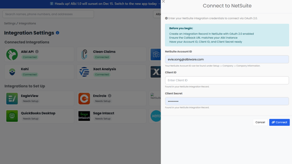 Initialize Connection Between Albi and NetSuite