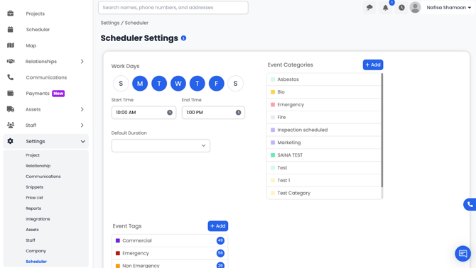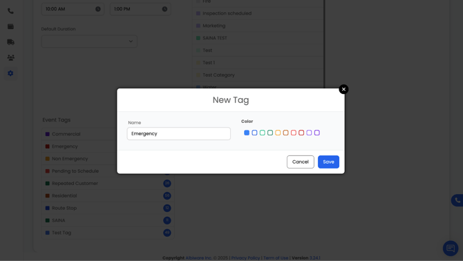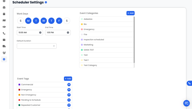 Event Tags give additional clarifying information about the scheduled event. Tags also have colors and can be combined with categories to provide more detail. Example: Emergency, Non-Emergency, Pending to Schedule, Repeated Customer, etc.
