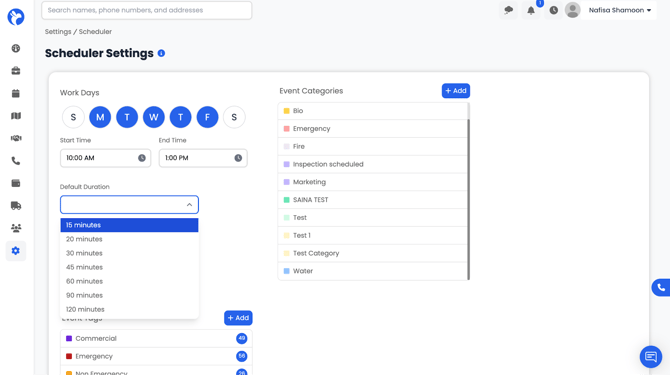 Workdays: Select the days your company operates. Only selected days will appear as active on your Scheduler calendar.