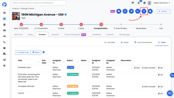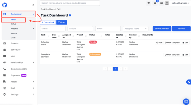 The Tasks Dashboard is where you can track, manage, and organize all tasks assigned to staff members across your company. It gives you a clear view of what needs to be done, who is responsible, and the current status of every task. From here, you can create new tasks, monitor progress, filter tasks by different criteria, and complete or update existing tasks.