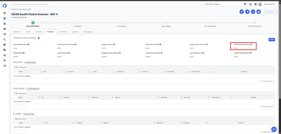 Sync equipment with expenses: When toggled on, equipment assigned to the project will pull into the Financial tab under the expenses card. This is useful if a piece of equipment has a billing type and cost associated with it. This will also update the “total actual expenses” KPI.