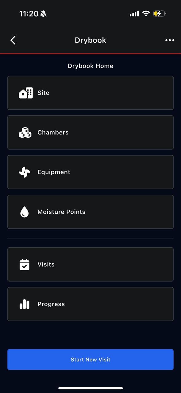 Drybook Home is the central navigation screen for all drying data within a project. It organizes the drying workflow into logical sections that mirror how work happens on site.