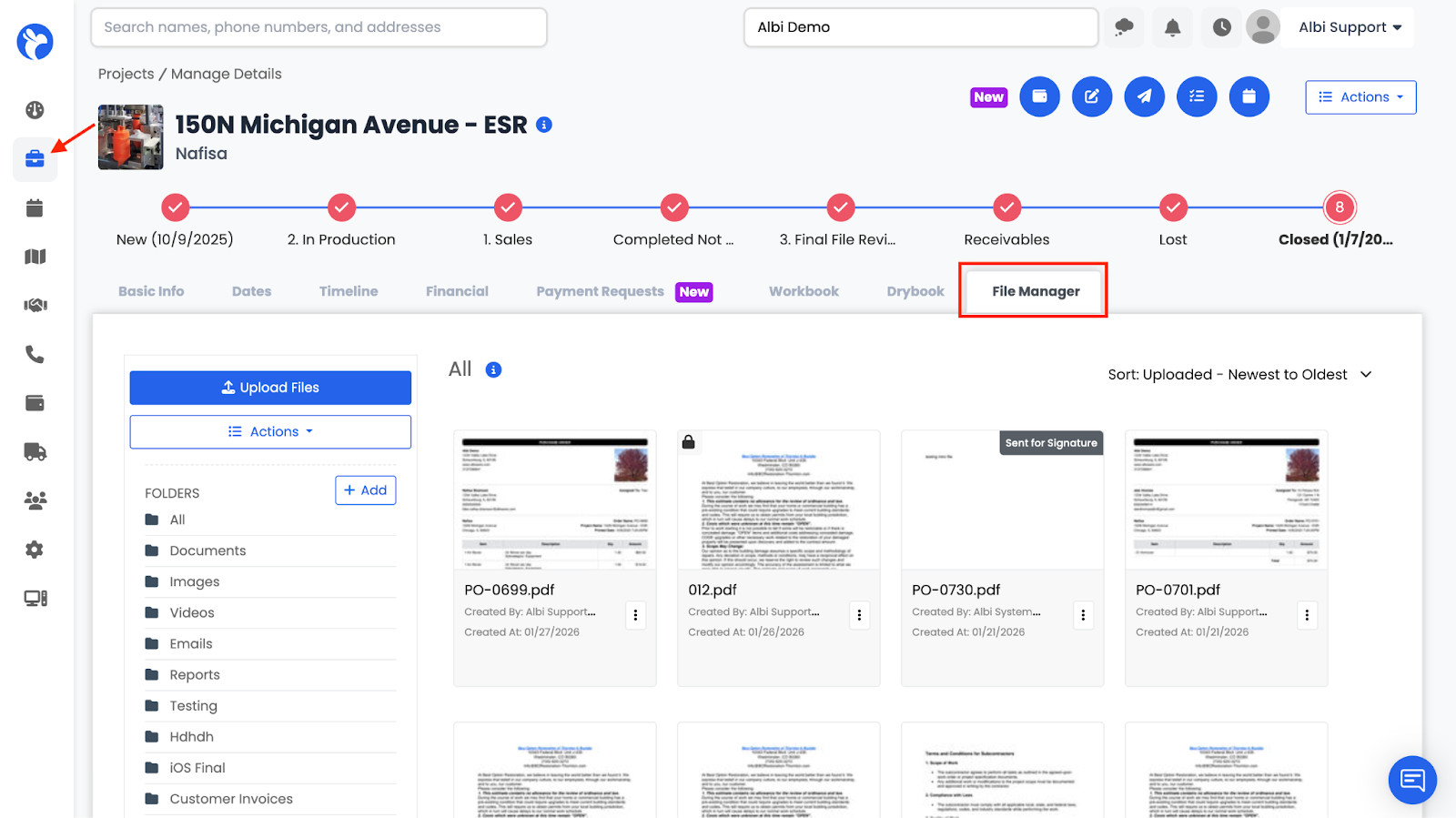 The File Manager is where all files related to a project are stored and managed, including documents, images, videos, reports, and signed files. From here, you can upload files, organize them into folders, manage versions, restrict, send documents for signature, generate project reports, and sync files from integrations.