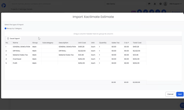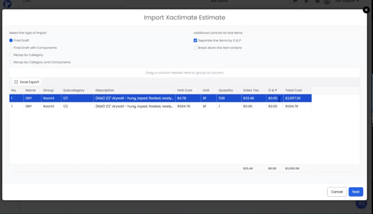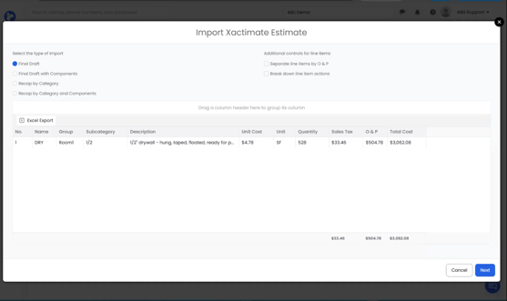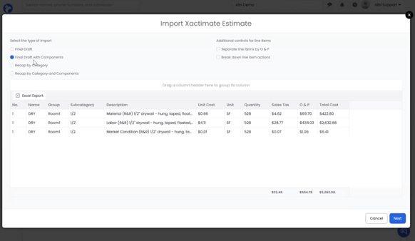 Imports line items 1-to-1 exactly as they appear in the Xactimate PDF/export. The Xactimate Final Draft import option allows you to bring a fully completed Xactimate estimate into Albi, including all finalized details—costs, materials, labor, and adjustments.