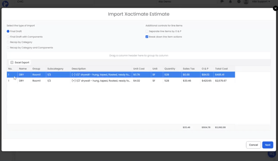 Imports a fully completed Xactimate estimate into Albi with an added layer of detail. In addition to bringing in all finalized information—costs, materials, labor, and adjustments—this option breaks each eligible line item into its individual components.